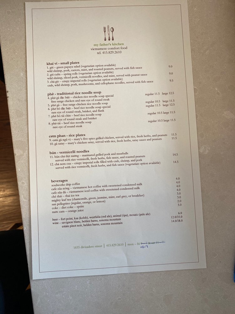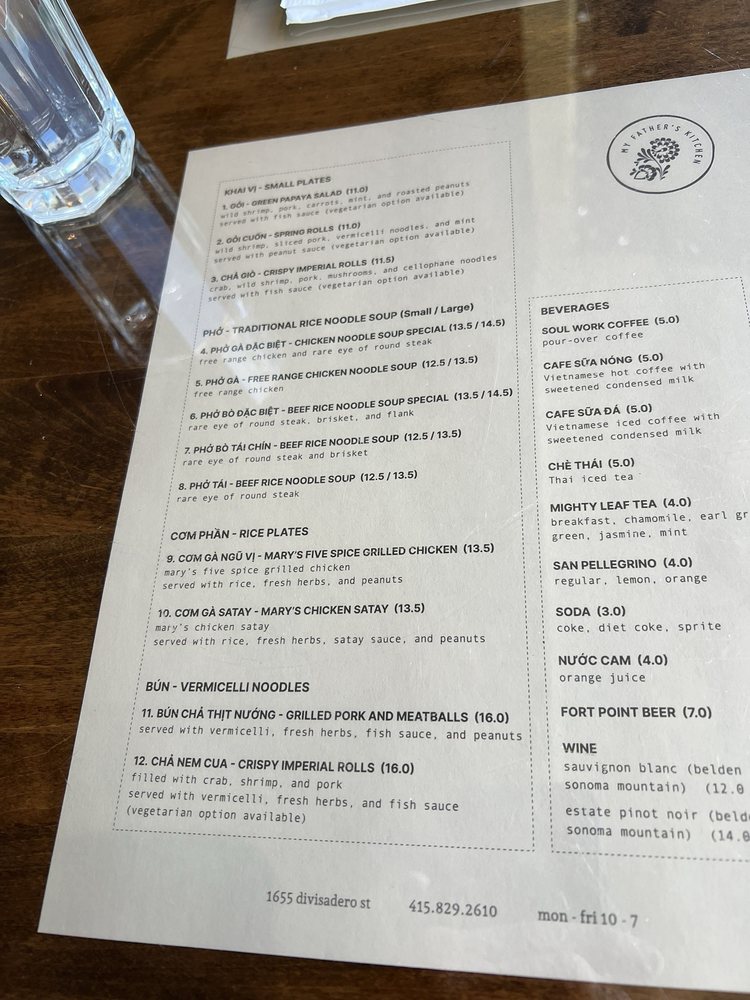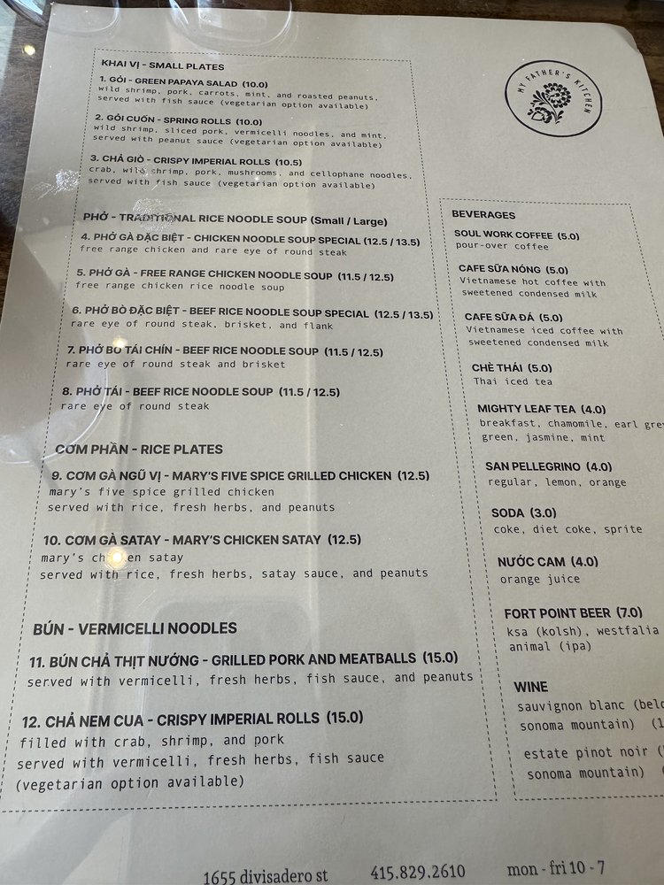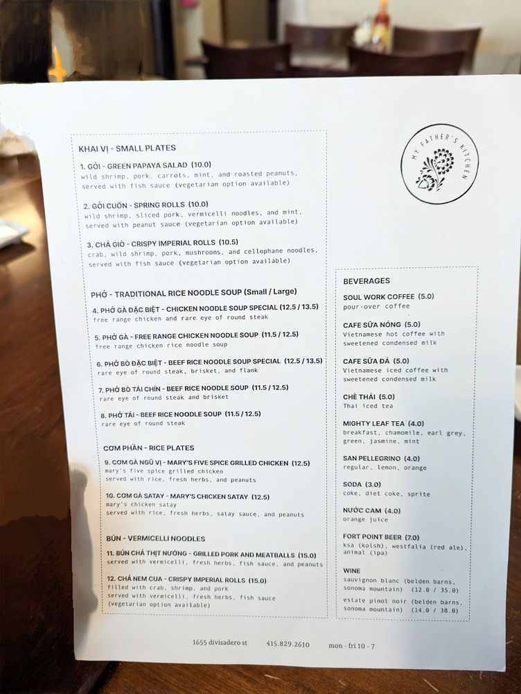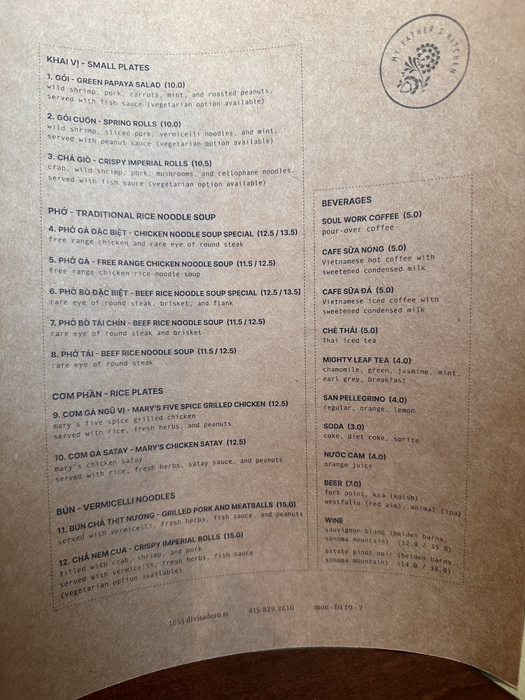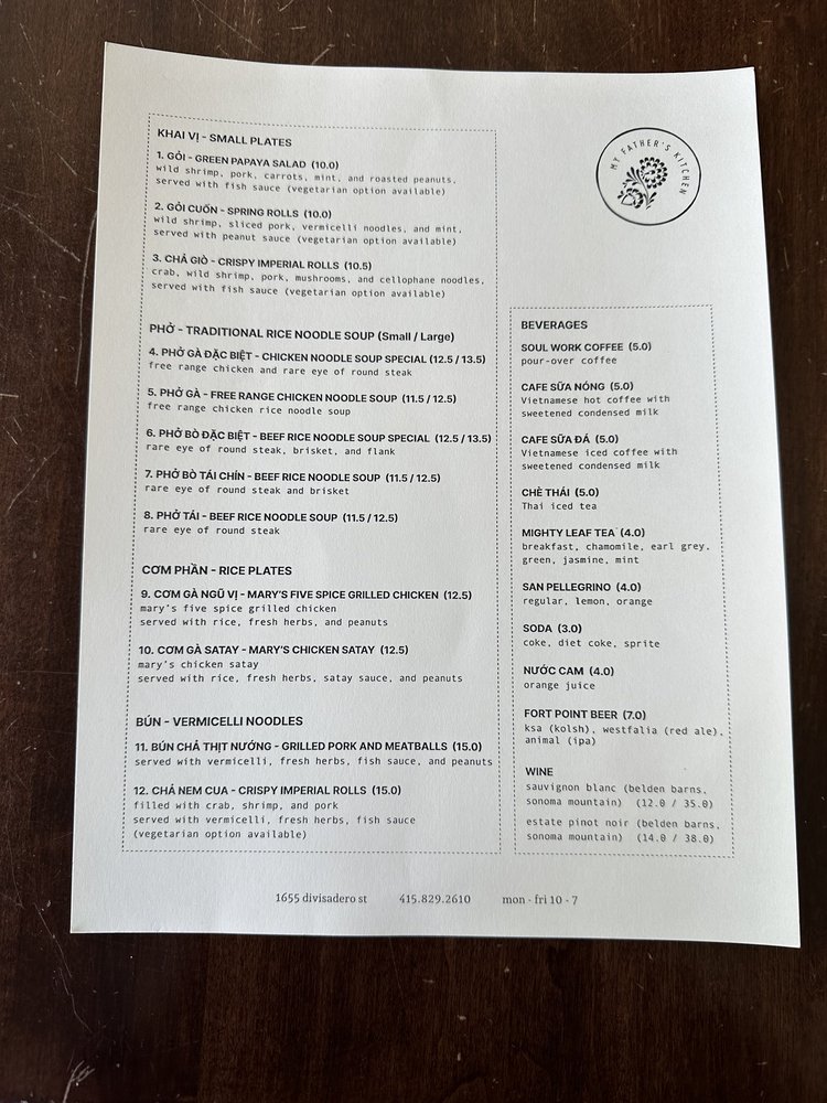 Introducing the menu at My Father’s Kitchen, a cozy Northern Vietnamese noodle house in San Francisco. This neighborhood gem offers delivery, takeout, and reservations, with options for pescatarians and vegans. The menu features delightful dishes like beef pho, chicken pho, bun cha thit nuong, and spring rolls with flavorful broths and fresh herbs. Customers rave about the healing powers of their pho, the comforting noodle textures, and the clean and savory flavors. The restaurant prides itself on friendly service, prompt attention, and a relaxing atmosphere perfect for lunch or a quick bite. With a focus on traditional preparation, My Father’s Kitchen offers a taste of authentic Northern Vietnamese cuisine that will leave you satisfied and craving more. Treat yourself to a unique dining experience where every bite feels like home.