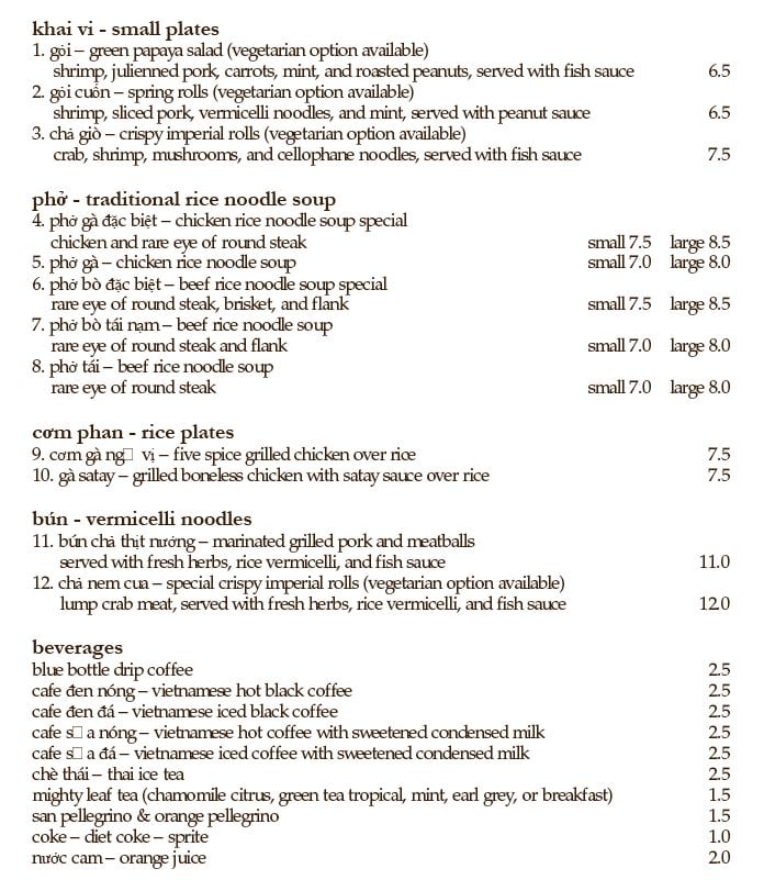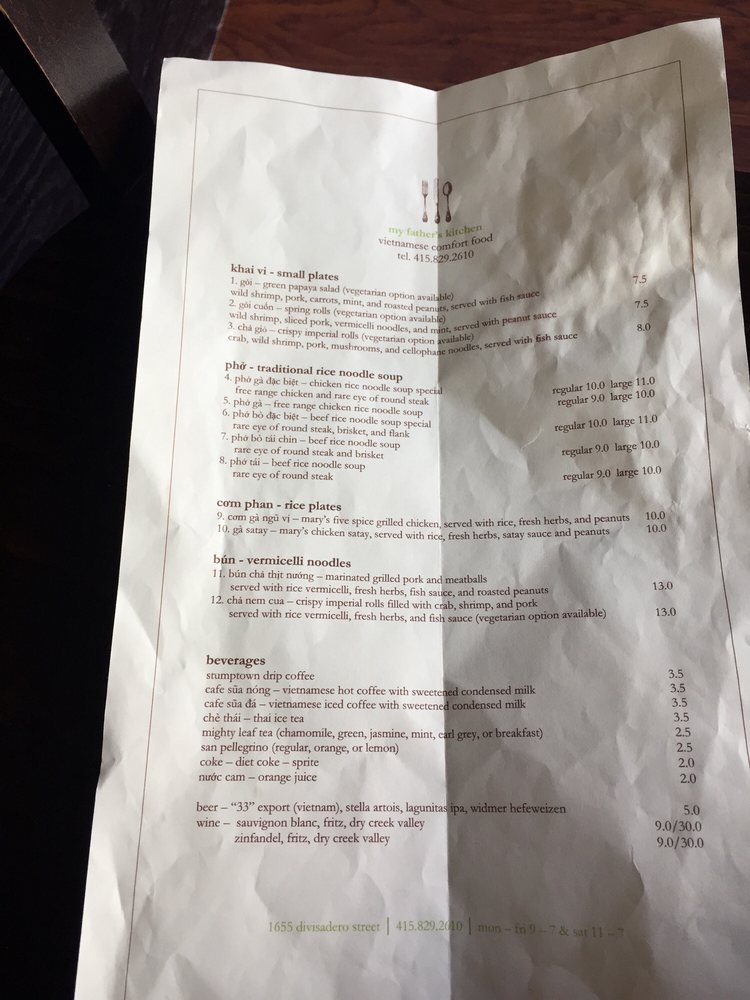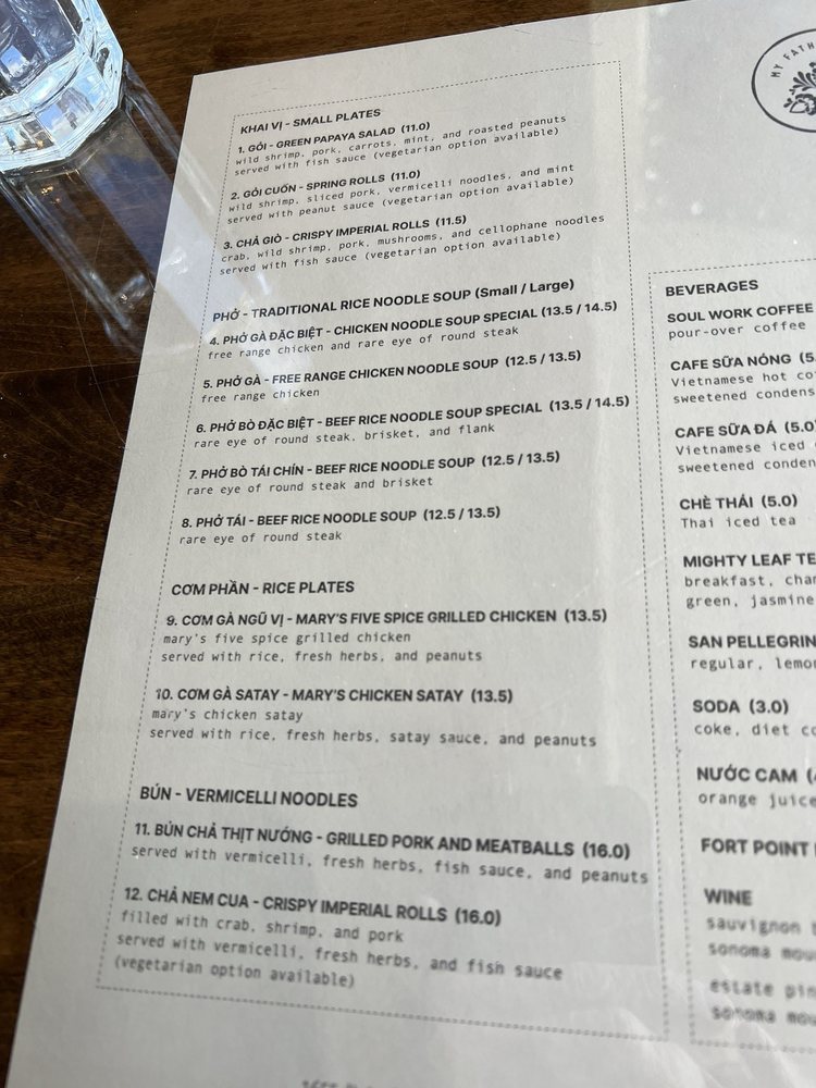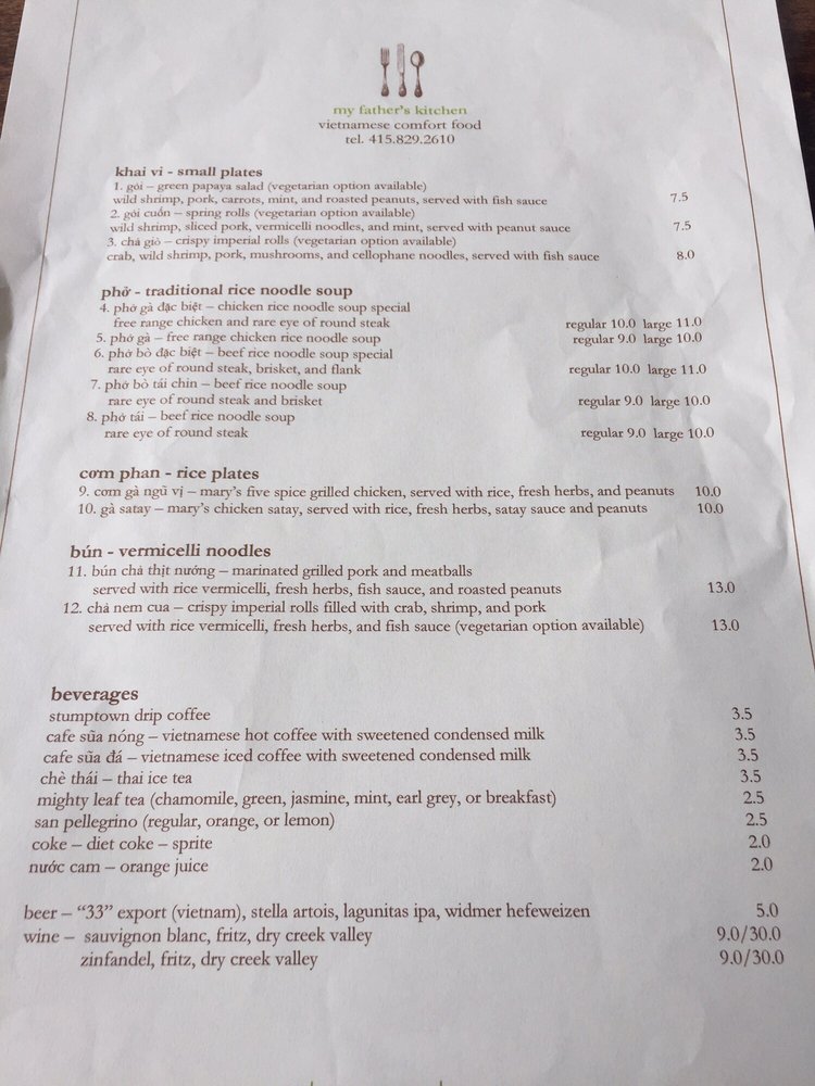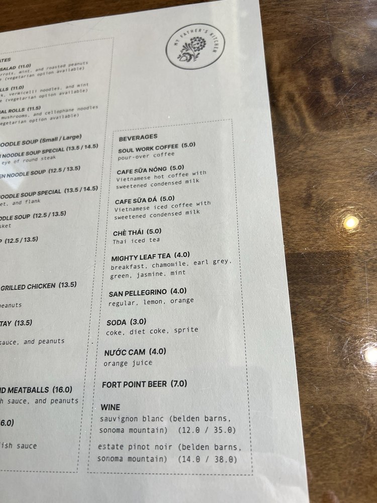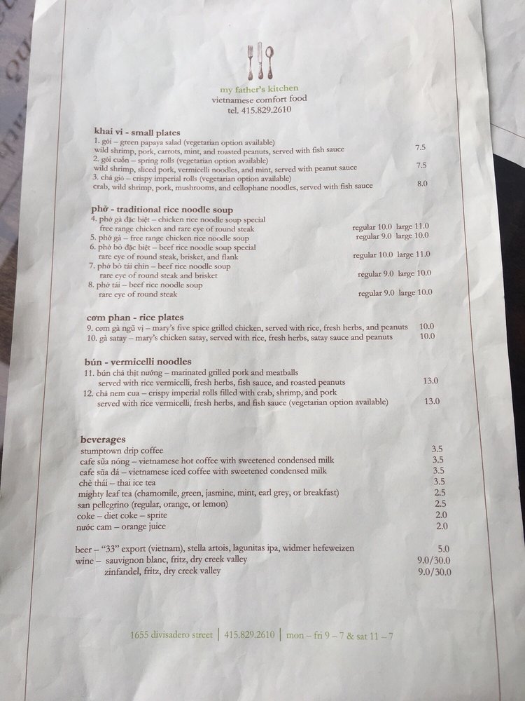 Introducing the menu at My Father’s Kitchen, a cozy Northern Vietnamese noodle house in San Francisco. This neighborhood gem offers delivery, takeout, and reservations, with options for pescatarians and vegans. The menu features delightful dishes like beef pho, chicken pho, bun cha thit nuong, and spring rolls with flavorful broths and fresh herbs. Customers rave about the healing powers of their pho, the comforting noodle textures, and the clean and savory flavors. The restaurant prides itself on friendly service, prompt attention, and a relaxing atmosphere perfect for lunch or a quick bite. With a focus on traditional preparation, My Father’s Kitchen offers a taste of authentic Northern Vietnamese cuisine that will leave you satisfied and craving more. Treat yourself to a unique dining experience where every bite feels like home.
